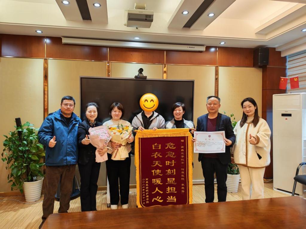 当天,受学校领导委托,临床医永利yl23411官网副院长朱鹏云、永利yl23411官网党委副书记陈敏、专职辅导员黄兰带领罗同学,专程前往第一附属医院护理部,向危急时刻挺身而出、成功施救学生生命的护士李荣芳同志当面致谢。朱鹏云代表学校送上感谢信,陈敏代表永利yl23411官网赠送了写有“危急时刻显担当 白衣天使暖人心”的锦旗和鲜花。